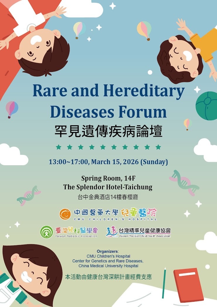 中醫大兒童醫院誠摯邀請您參加一場國際醫學盛會!本院將舉辦 「創新 × 治療 × 健康」(Innovation × Treatment × Health) 為核心主題,旨在匯聚國內外醫學專家,共同探討罕見遺傳疾病的前瞻醫療與臨床實務,期許透過知識轉譯與跨域合作,為患者開創更精準的治療契機與永續健康之未來。