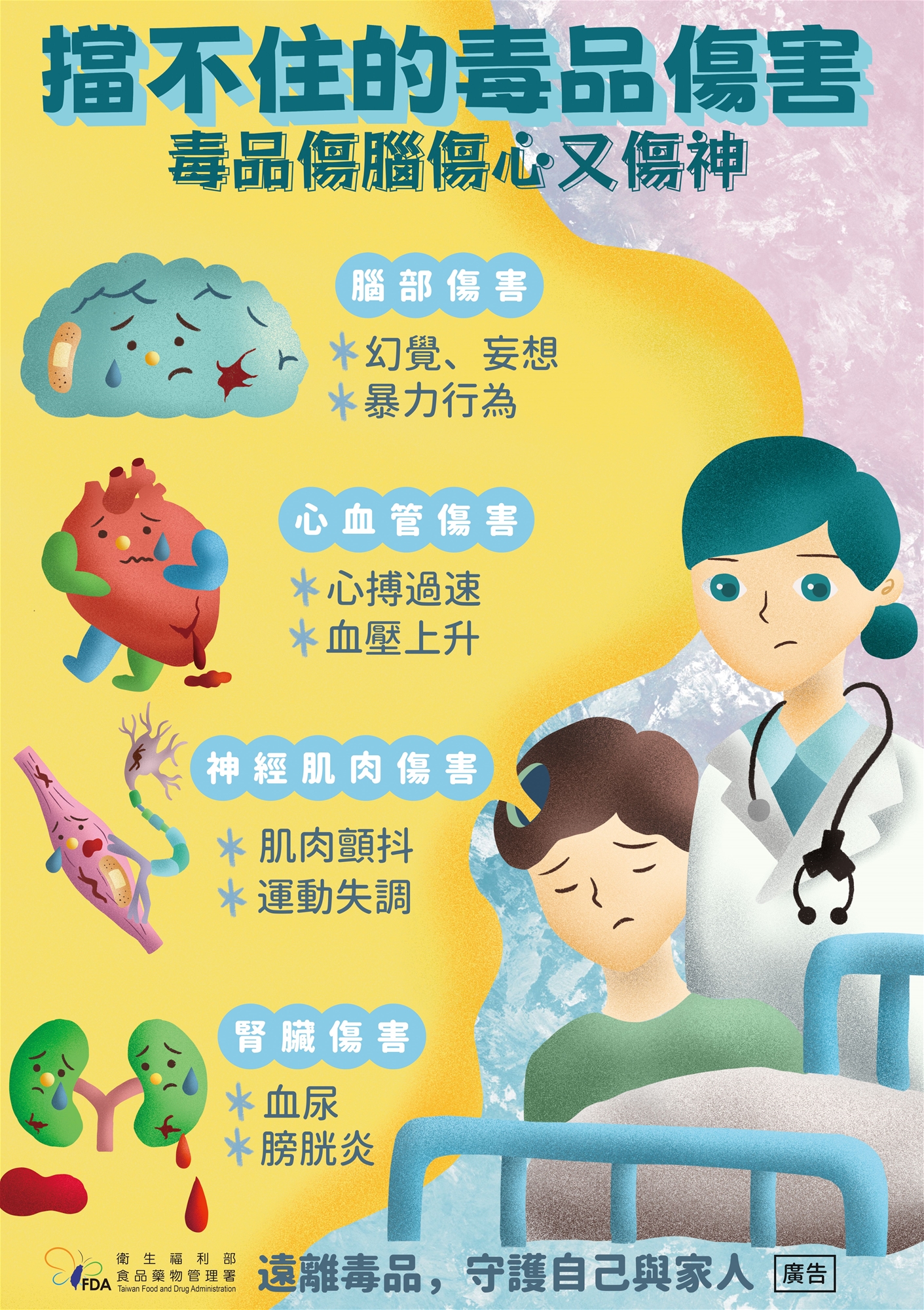 配合衛生福利部115年暑期專案 藥物濫用防制宣導,以及提升民眾對毒品危害之正確認識,本院提醒家長與青少年提高警覺,遠離毒品及新興毒品偽裝樣態。毒品可能傷害腦部、心血管、神經肌肉及腎臟功能,並造成成癮、幻覺、情緒失控等嚴重後果。